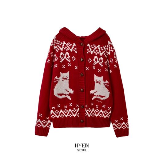 Cat jacquard hoodie cardigan red【IVE ウォニョン着用】