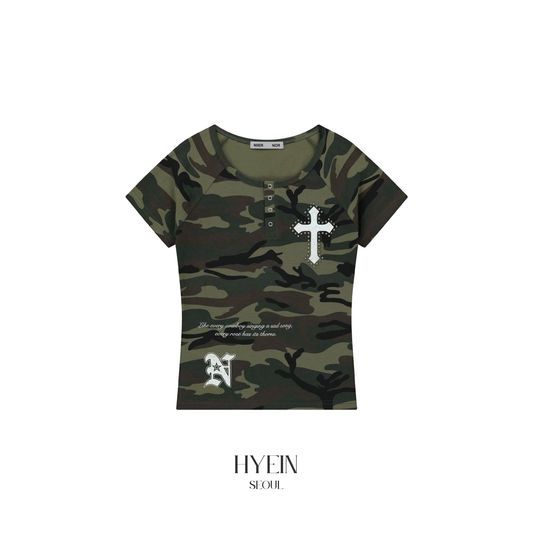 Vintage cross button down tee / camo【KISS OF LIFE ナッティ着用】